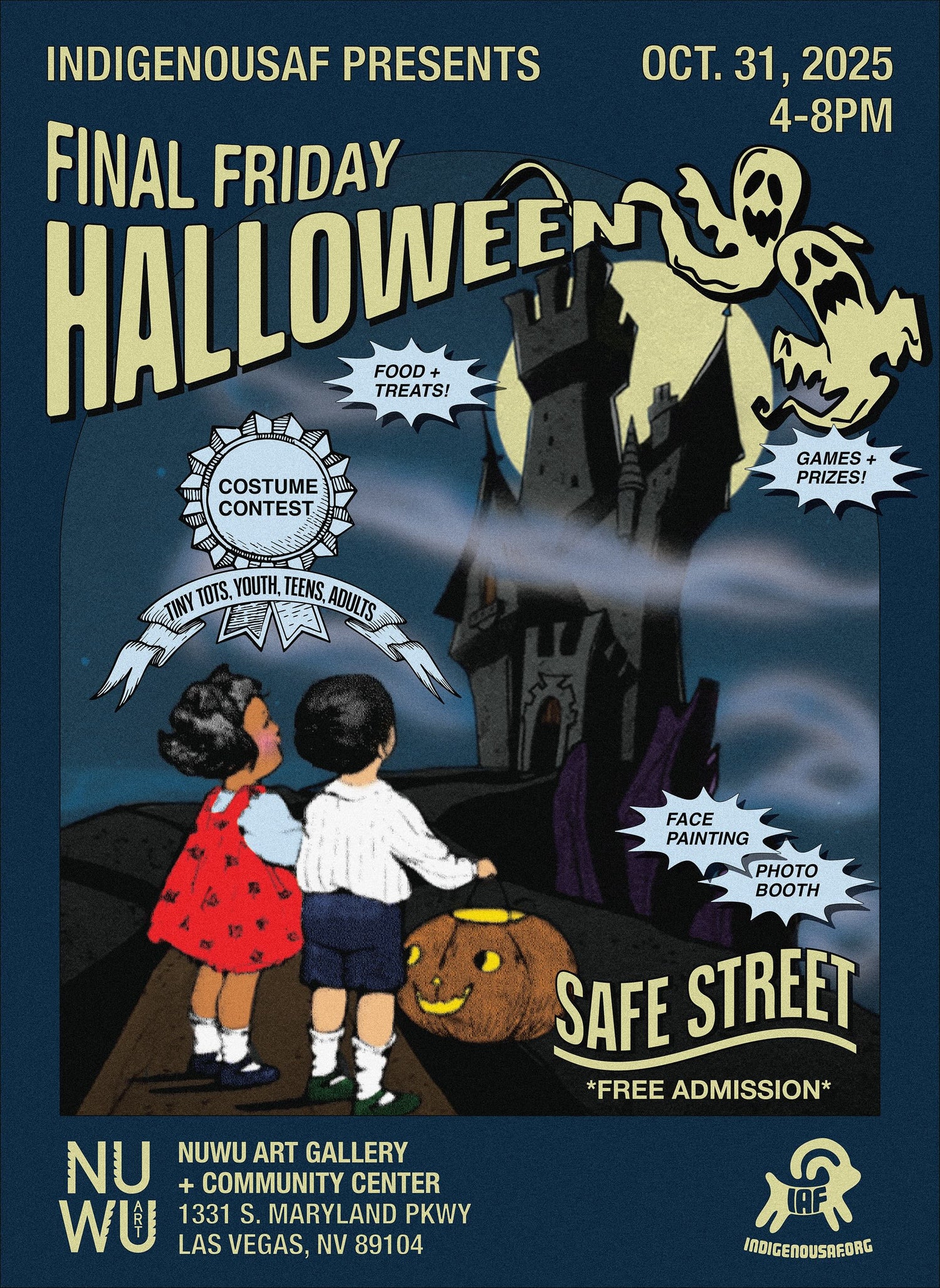 Musical chairs, four-square, dance-off, and carved pumpkin contests (pumpkins must come pre-carved or decorated). Costume contest categories: Tiny Tots, Youth, Teens, and Adults.
